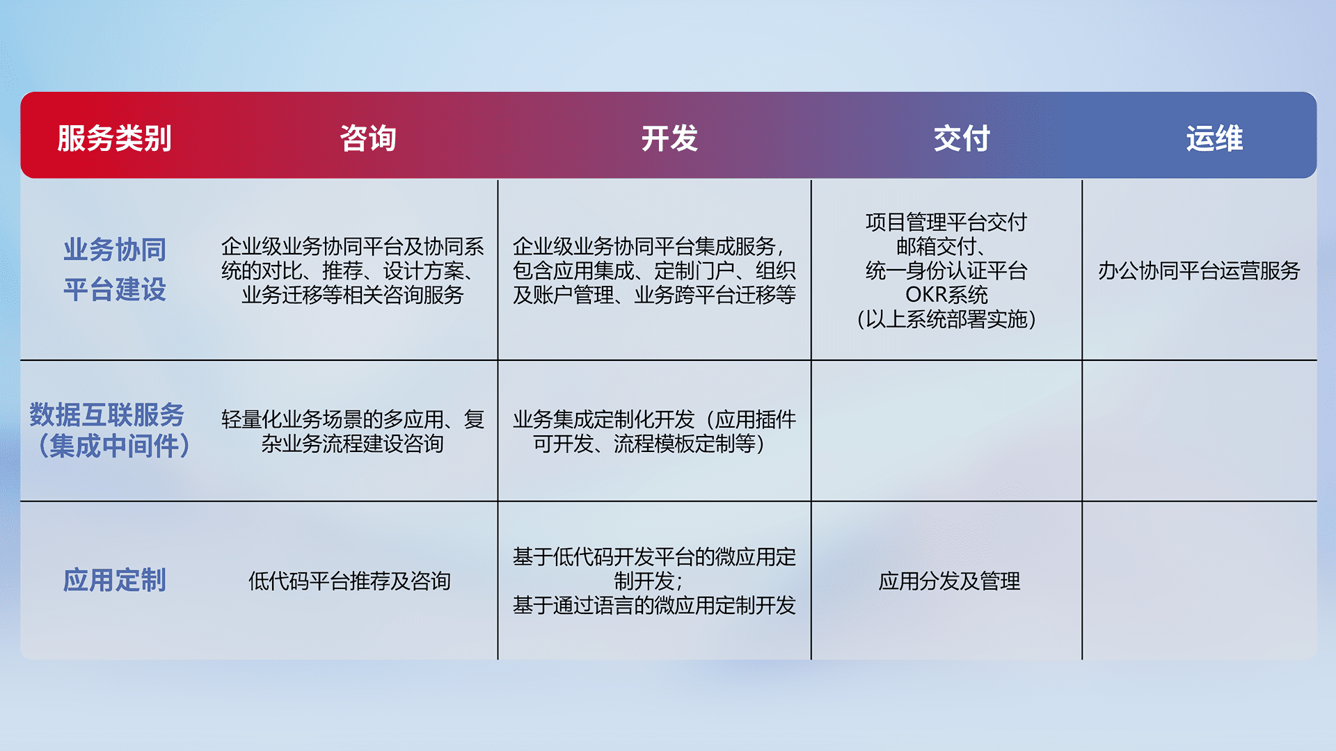 针对钉钉、、、企微、、IDaas等平台级产品提供产品的规划、、、、方案、、、、交付、、定制化开发等服务,,,,实现如统一协同办公、、智能客户服务、、混合会议管理、、智能数据查询、、等业务场景,,实现数字化转型。。。。
