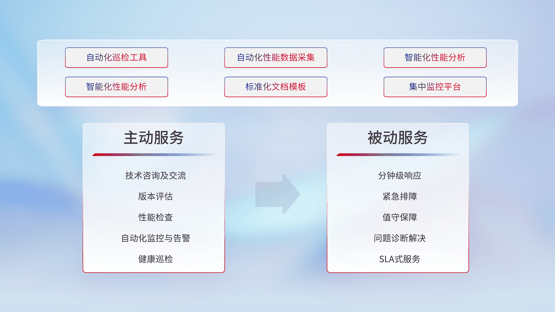 智能化工具和标准化文档,,保障服务质量,,,,提供主动服务(包含技术咨询、、版本评估、、性能检查、、自动化监控与告警、、、健康巡检)和被动服务包含(分钟级响应、、、紧急排障、、、值守保障、、、、问题诊断解决、、、SLA服务)。。。。